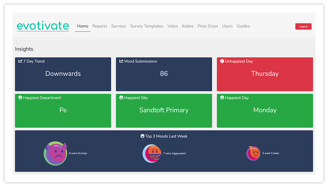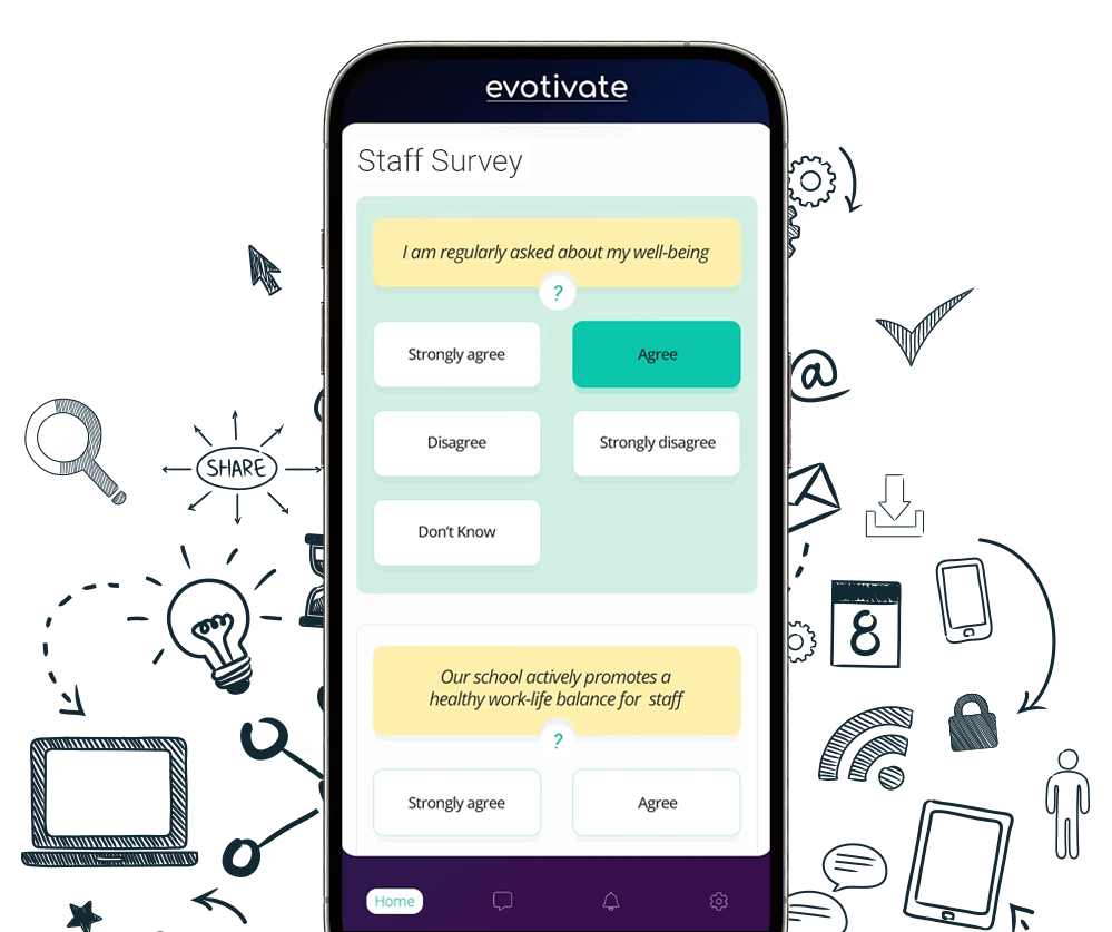 Evotivate is a user-friendly platform designed to help schools and Multi-Academy Trusts prioritise staff wellbeing and engagement. Evotivate offers a range of tools and resources that can be tailored to the specific needs of your organisation - empowering you to create a positive and thriving work environment with clear communication and business insights into the 'pulse' of your team.